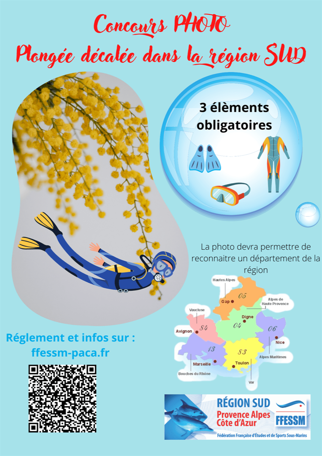 Concours photo intitulé « plongée décalée » ouvert à tous les licenciés de la région pour mettre en avant nos départements. Il n’est pas nécessaire d’être photographe sous-marin, c’est l’imagination et la créativité qui prime.(concours jusqu’au 30 octobre réservé aux licenciés de la région SUD PACA)